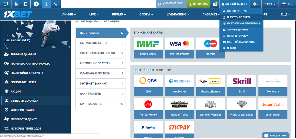 Пополнение 1хбет счета